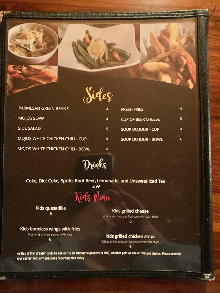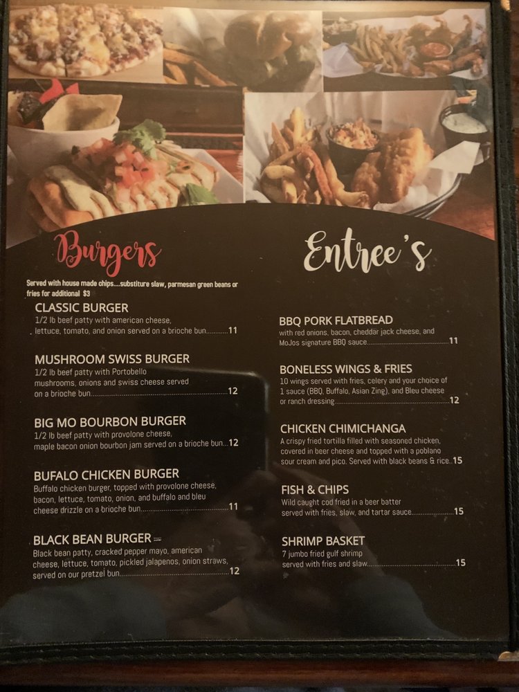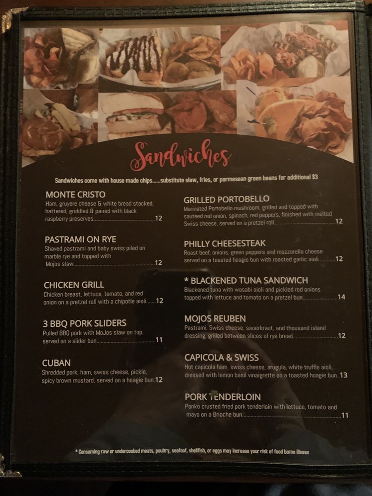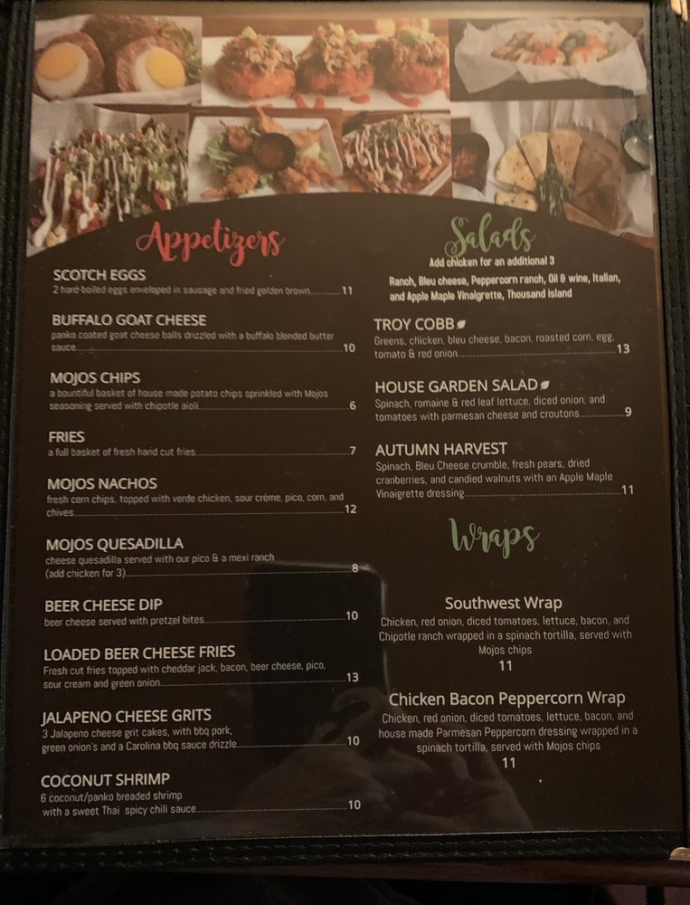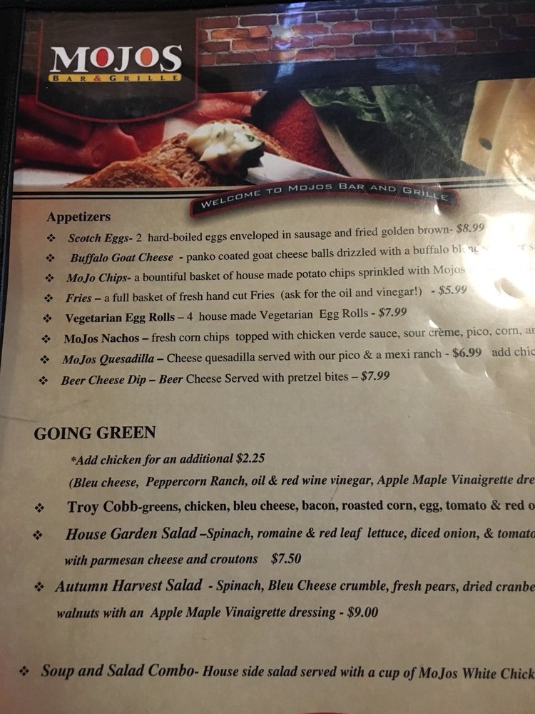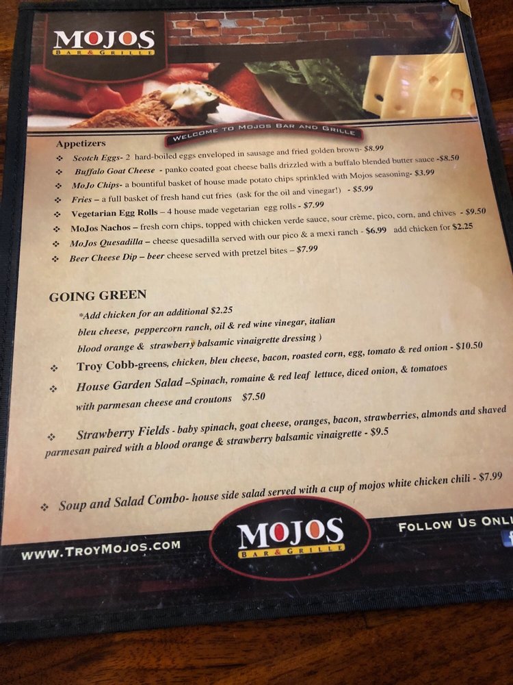 Introducing Mojos Bar & Grille, a cozy spot in Troy offering a diverse menu of sandwiches, salads, and appetizers. The Autumn Harvest Salad with a mix of spinach, bleu cheese, pears, cranberries, and walnuts stands out, alongside the classic House Garden Salad and hearty Troy Cobb. Indulge in their delectable Wiches like the BBQ Pork Sliders or Pastrami on Rye. Appetizer lovers will rejoice over the Buffalo Goat Cheese balls and Mojo Chips. Customers rave about the great food, friendly service, and inviting ambiance. Tracy O. praises the burgers and sandwiches, while Gigigirl1952 hails the Mushroom Swiss Burger as a top 10 contender. Marie T. delights in the Parmesan green beans, and Amy S. recommends the Buffalo Goat Cheese appetizer. Discover the excellence of Mojos Bar & Grille and treat yourself to a memorable dining experience.